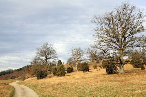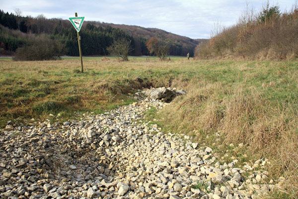 Folgt man der Kreisstraße K 7400 von Altheim nach Heldenfingen auf der Ostalb, dann durchquert man ein Tal mit dem merkwürdigen Namen "Hungerbrunnental". Der Talgrund ist mit Mahdwiesen bedeckt, die Ränder zieren Heideflächen mit bizarren alten Eichen. Wie fast überall auf der Schwäbischen Alb deutet eigentlich nichts auf ein oberirdisches Fließgewässer hin. Niederschläge versickern meist gleich im karstigen Gestein und treten am Rande des Gebirges als Karstquellen wieder zutage. Ein berühmtes Beispiel ist der der Blautopf bei Blaubeuren. Auch im Hungerbrunnental befindet sich eine solche Karstquelle. Vom Parkplatz aus erreichen wir sie nach einigen hundert Metern talaufwärts. Fast immer sieht man dort lediglich eine unscheinbare, trockene und mit Steinen bedeckte Mulde. Wäre da nicht ein Naturdenkmalschild und eine Hinweistafel, die über die hydrogeologischen Besonderheiten des Ortes aufklärt, man würde an diesem Platz glatt vorbeilaufen. Nur selten, nach ergiebigen Niederschlägen, sprudelt hier plotzlich eine muntere Quelle: der Hungerbrunnen. Für den eigenartigen Namen habe ich übrigens zwei plausible Erklärungen gefunden: Die seltene Wasserschüttung dieser periodischen Quelle, die meist jahrelang "hungert", scheint eine ebenso plausible Deutung zu sein, wie der Umstand, dass das Ausbleiben von Niederschlägen, auf das die trockene Quelle hinweist, oft mit geringen landwirtschaftlichen Erträgen - und damit in früheren Zeiten mit der Gefahr von Hunger - verbunden ist.