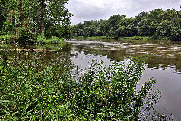 Nur wenige Schritte sind es bis zur Donau. Hier mündet die Kleine Paar, die wenige Meter zuvor bereits die Friedberger Ache aufgenommen hat, gefällefrei in die Donau. Der Blick fällt auf das gegenüberliegende Ufer. Der Schein trügt, denn unmittelbar hinter den Uferbäumen zieht sich der Hochwasserdamm am Ufer entlang - vom Grün des Sommers gnädig verborgen.