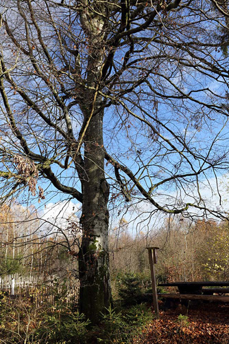Nicht ahnend, welch große Entdeckung heute auf mich warten würde, durchstreifte ich einen Forst bei Roggenburg (Kreis Neu-Ulm), als mein Blick auf eine mir bislang unbekannte Baumart fiel. Ich sollte korrekterweise sagen, dass ich dem fremdartigen Gewächs gar keine Beachtung geschenkt hätte, wäre da nicht diese kleine Tafel gewesen, die meine Aufmerksamkeit erregte: Methusalem-Buche. Eigentlich hätte ich den Baum für eine schlichte Rotbuche gehalten, vielleicht etwas größer und etwas dicker als die üblichen Forstexemplare, aber doch ein herkömmlicher Vertreter der Spezies Fagus sylvatica.