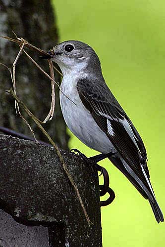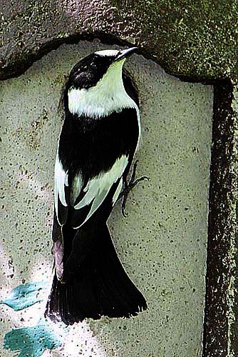 Halsbandschnäpper - links das Männchen, rechts das Weibchen - nehmen gerne künstliche Bruthöhlen an. Allerdings sollte man die Fluglöcher der Nisthilfen bis Ende April verschließen. Als Langstreckenzieher und Spätrückkehrer aus seinen südlichen Überwinterungsgebieten findet dieser zierliche Waldvogel sein Quartier sonst regelmäßig bereits von den aggressiveren Kohlmeisen besetzt vor. |