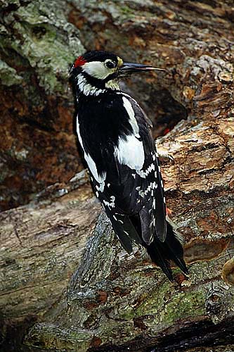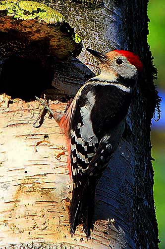 | Links, das ist ein Mittelspecht an seiner Bruthöhle. Charakteristisch ist die rote Kopfplatte und die weitgehend fehlende schwarze Zeichnung an den Kopfseiten. Zum Vergleich: Das Buntspechtmännchen (rechts) hat lediglich einen roten Scheitelfleck. Auch sind die Kopfseiten deutlicher schwarz abgesetzt. | |